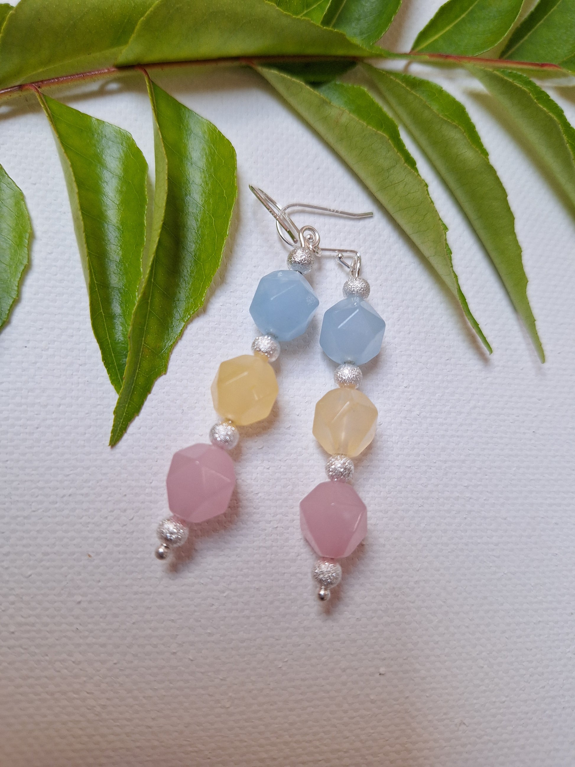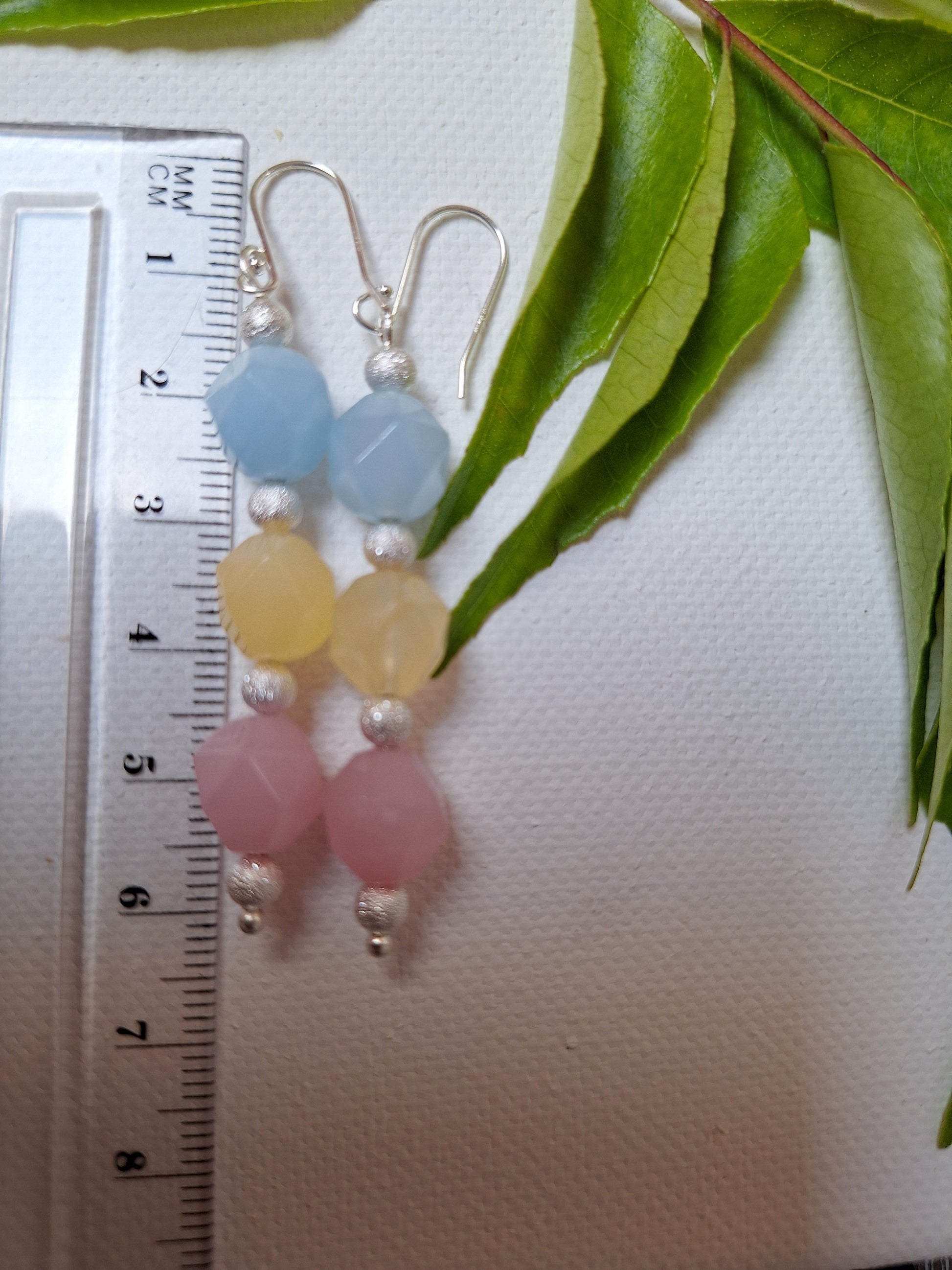 These earrings have been named after Ali Hussam Azzam, a newborn baby who died of hypothermia in his tent in Gaza at just 4 days old. 8mm Malaysian jade faceted gems (dyed Quartzite) interspersed with stainless steel sparkly spacer beads on sterling silver earring posts, these earrings measure 6.5 cms from top to bottom and were designed by my 6 year old daughter