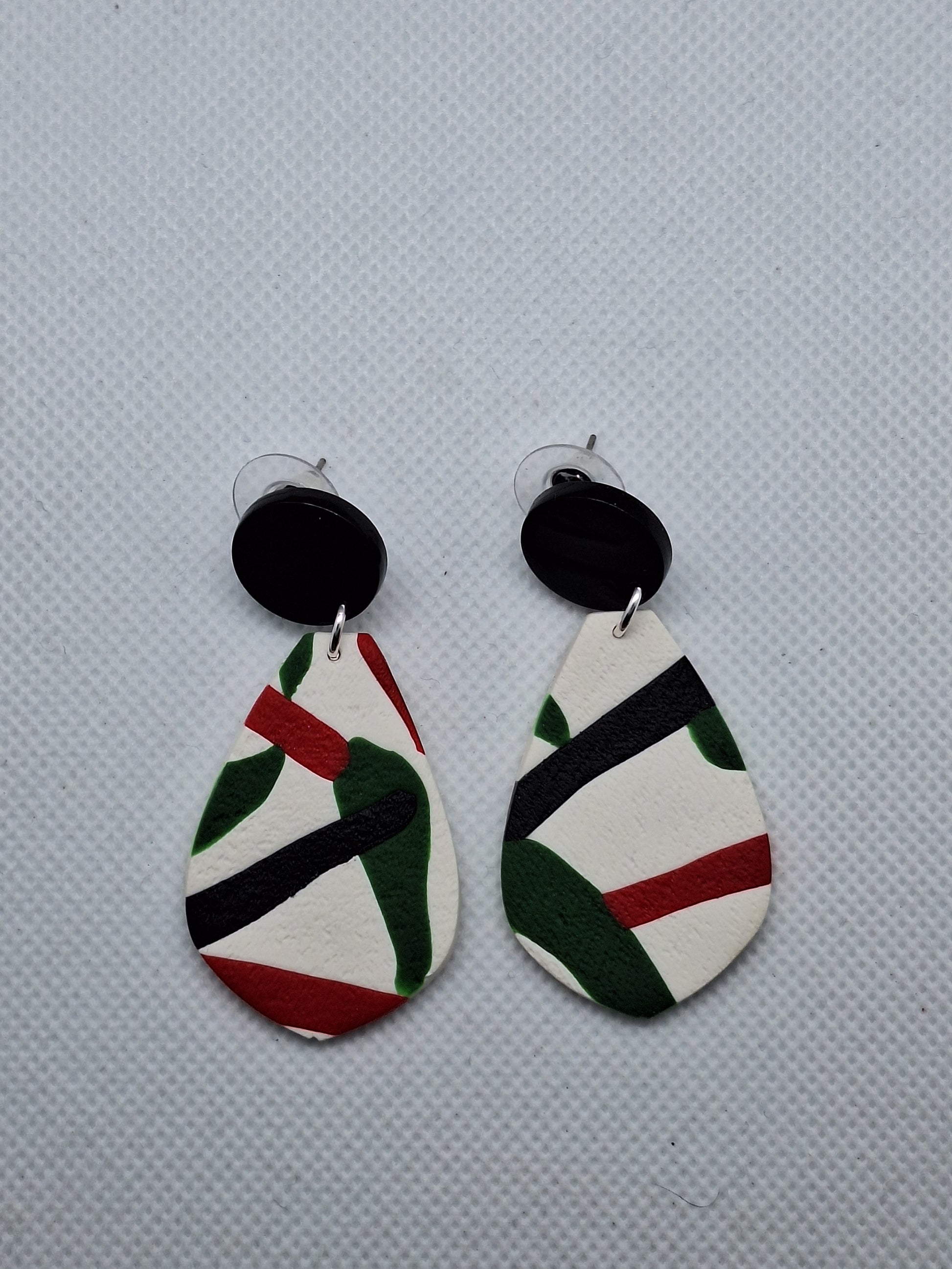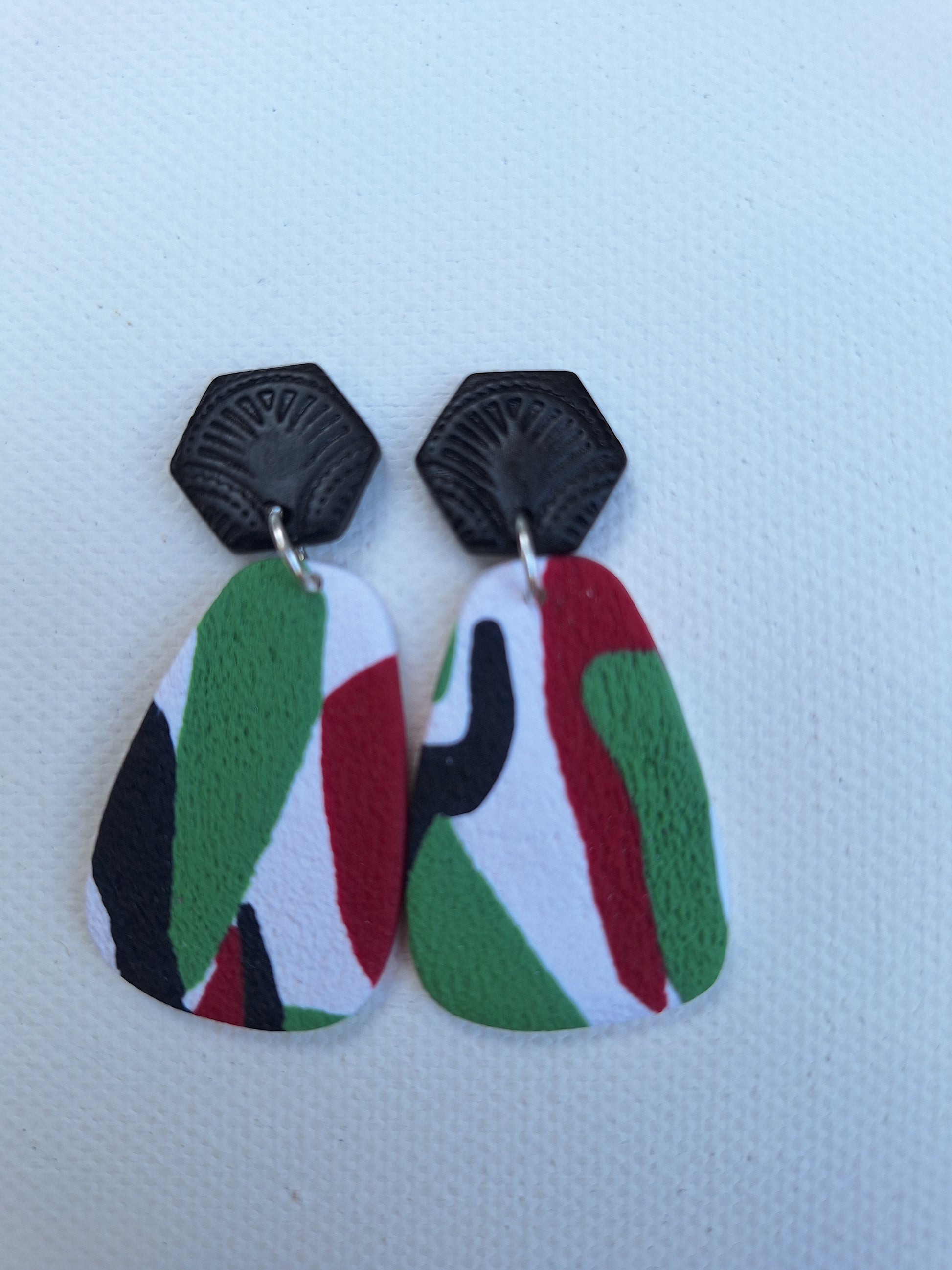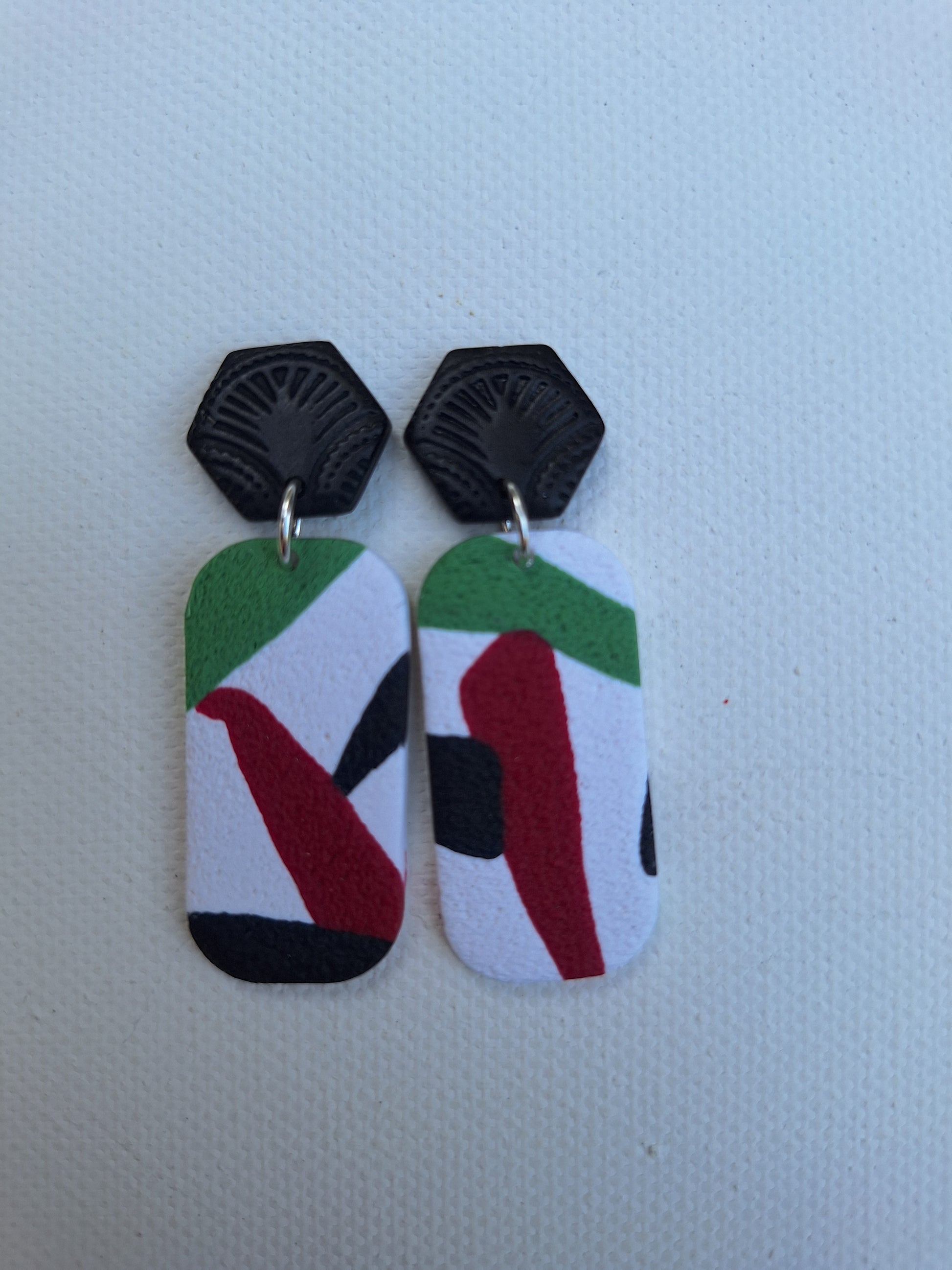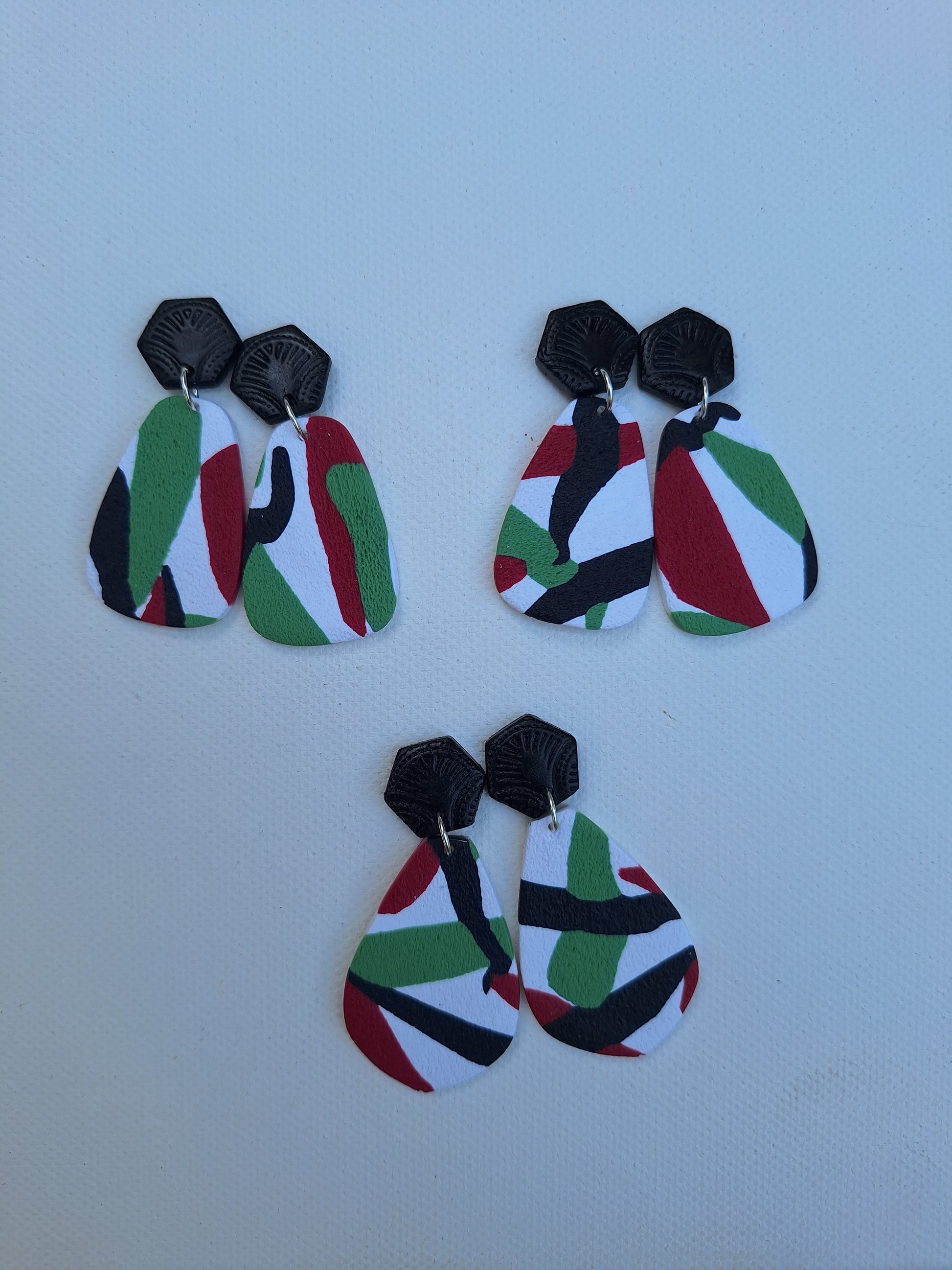 Farah is named after a 19 year old artist we know in Gaza who is trying to provide for her elderly parents, her sister and her small nephew and niece. Farah is a talented artist who was looking forward to going to university this year. Farah is modern and abstract and comes in three different shapes. Sculpey polymer clay with stainless steel earring posts.