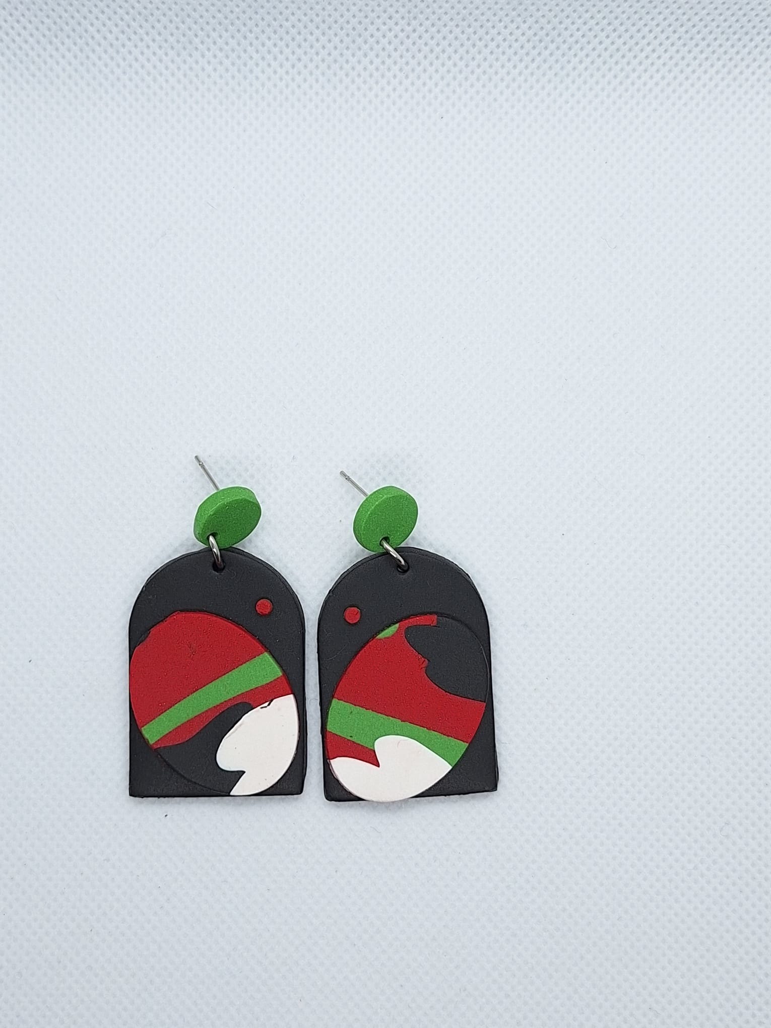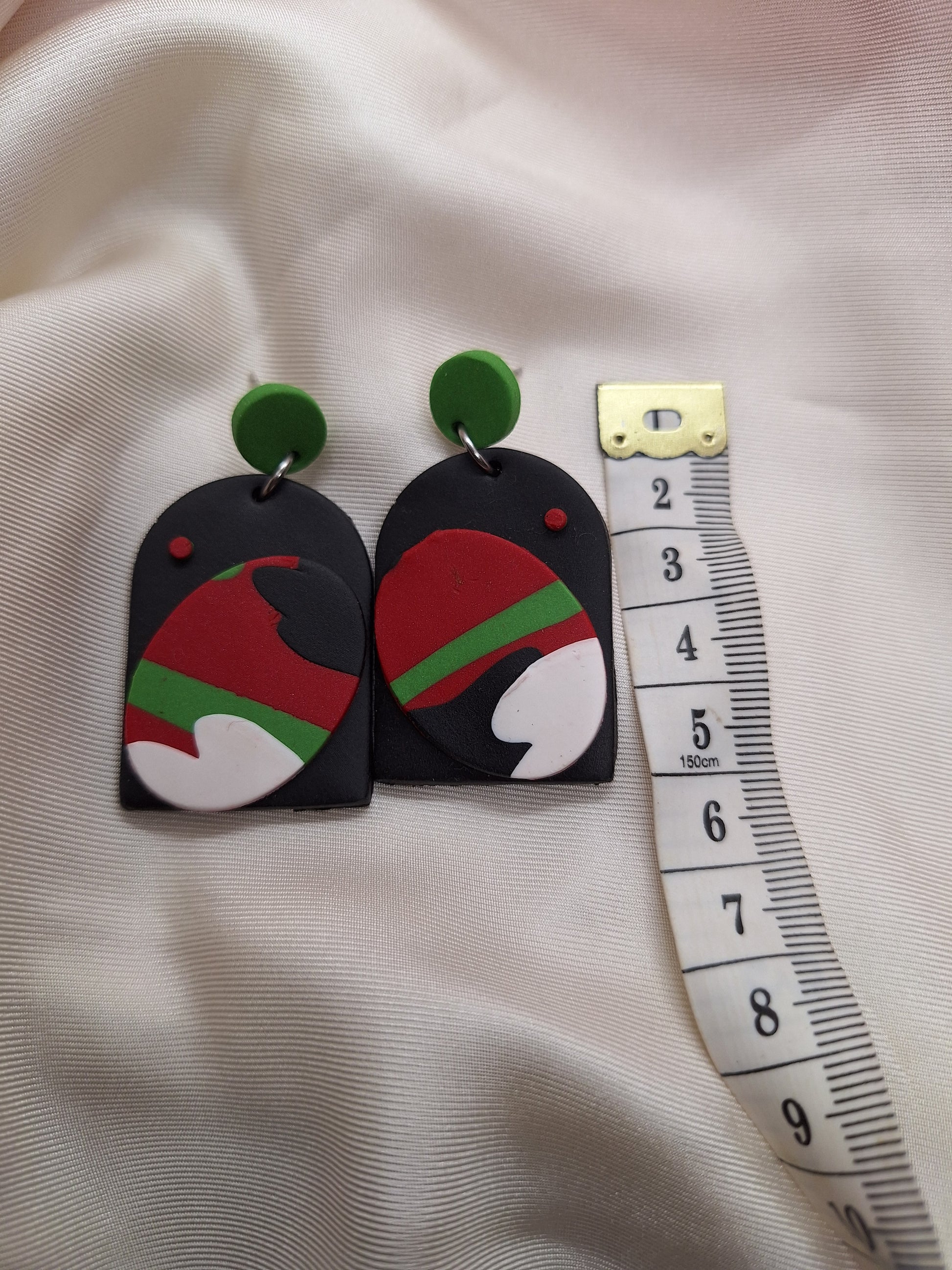 Manal is part of our Om Collection, 5cm drop with black, red, green and white sculpey clay and steel hardware.
